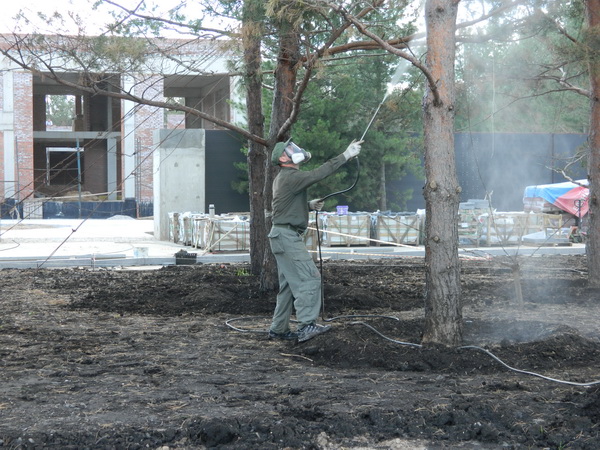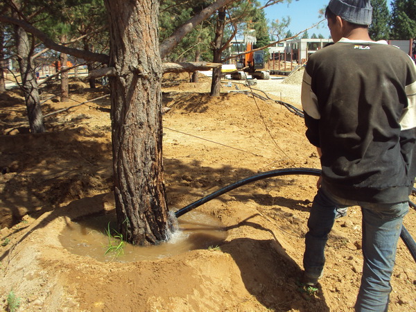 Для начала поговорим о поливе. Он должен гарантировать постоянную нормальную влажность почвы по всей глубине роста корней кустарников и деревьев. Наилучшее развитие у дерева достигается при средней влажности почвы 60-70%. Полив следует осуществлять ежедневно в утреннее или вечернее время. Площадь полива должна быть не меньше, чем площадь проекции кроны. Оптимальная глубина полива 50-60 см.