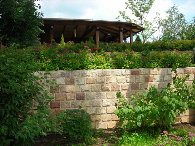 Если угол склона выше пятнадцати градусов, то лучше всего воспользоваться террасированием. Такой термин подразумевает создание горизонтальных площадок, укрепленных стенками. Учитывайте, что размеры участка напрямую влияют на количество и высоту террас. Каждая площадка соединяется между собой при помощи лестниц, которые гармонируют с подпорными стенками.