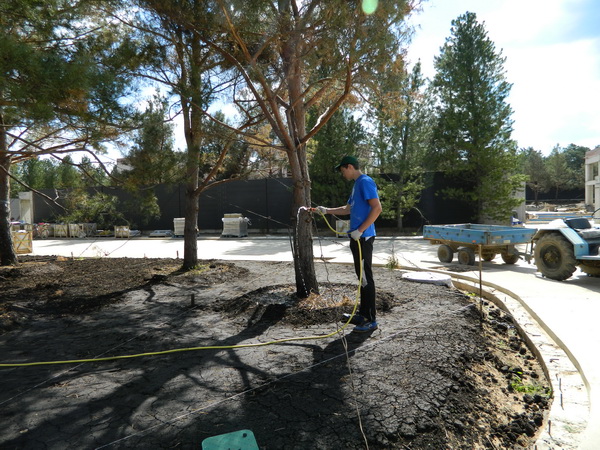 Для начала поговорим о поливе. Он должен гарантировать постоянную нормальную влажность почвы по всей глубине роста корней кустарников и деревьев. Наилучшее развитие у дерева достигается при средней влажности почвы 60-70%. Полив следует осуществлять ежедневно в утреннее или вечернее время. Площадь полива должна быть не меньше, чем площадь проекции кроны. Оптимальная глубина полива 50-60 см.